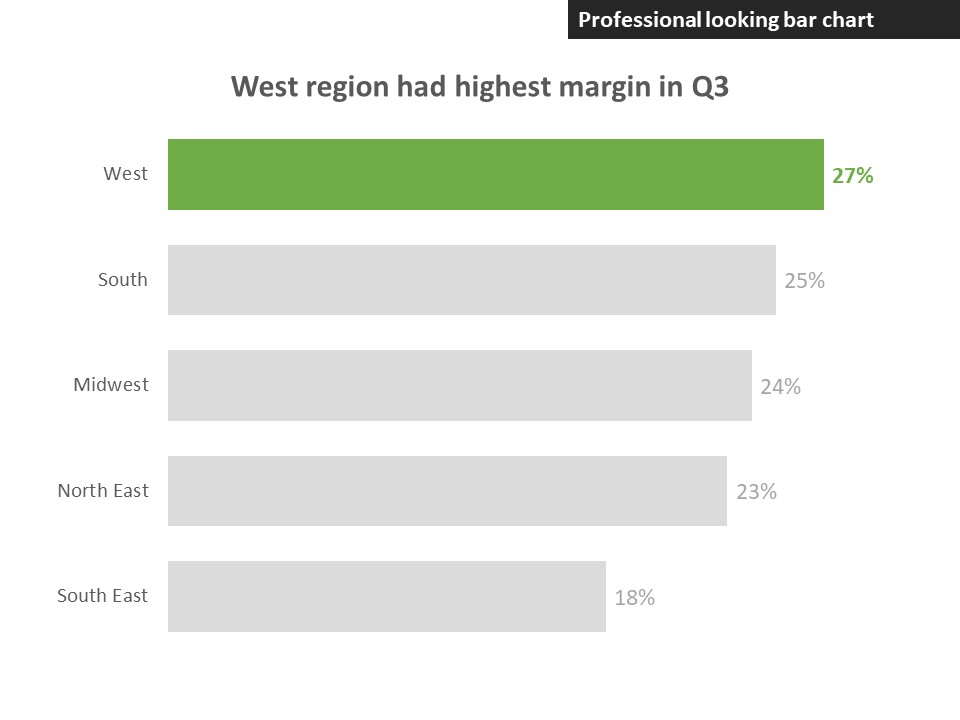A bar chart is used to rank values from largest to smallest, usually in a single series of data. Creating a bar chart in Excel or PowerPoint is simple, but making it look professional requires you to change some of the defaults in the chart. Here are 8 steps to turn a default bar chart into a professional looking bar chart.